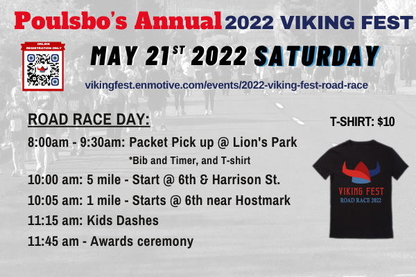Have you heard? VIKING FEST is coming to town and so is our annual Road Race! Come seize the day and start your Saturday, May 21st morning right with this perfect family-friendly event for all ages in our fun road race run. Complete your choice of a 5M, 1M, and Kids Dash along our beautiful Poulsbo waterfront!Â